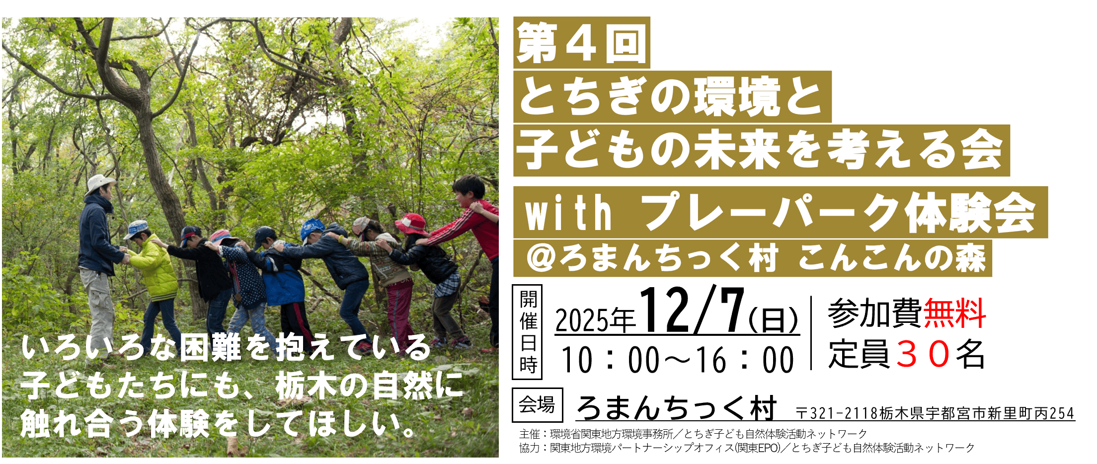 12/7(日)【栃木県】第4回 とちぎの環境と子どもの未来を考える会 withプレーパーク体験会@ろまんちっく村こんこんの森