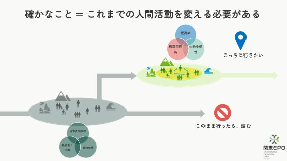 「地域の持続可能性の向上」という、EPOの根源的なミッションを考えるとき、社会的には、どうしても、人が「疎」になることによって表出している社会課題や環境課題、つまり地方部の地域課題に目が向きがちです。しかし、これらの問題は、実際は、人が「過密」になっている地域、つまり都市部とつながっています。