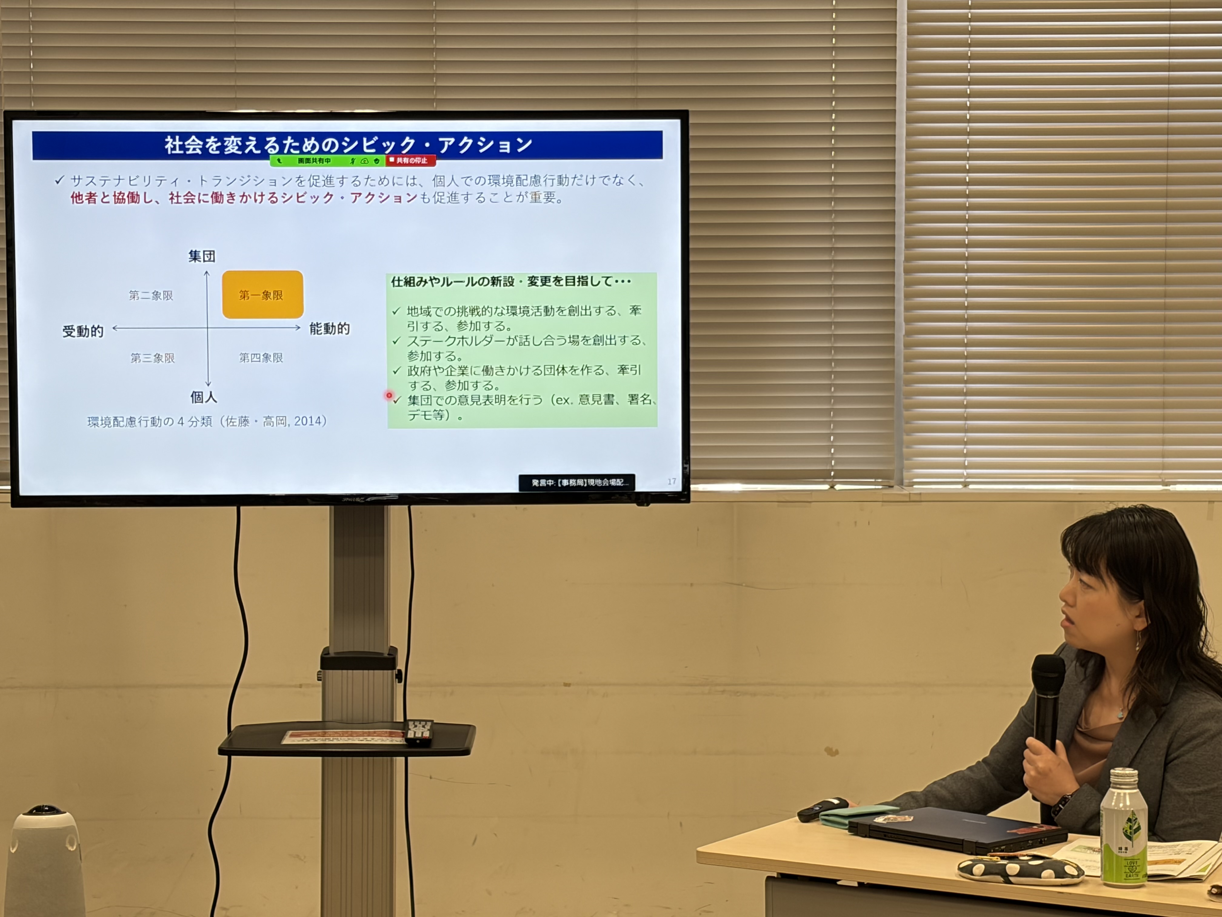 - 社会のシステム=レジームを変えるという発想: 個人の意識だけでは変えられない、社会のルールや仕組みそのものを転換していくためには、主語を「私」から「私たち」に変えて考え、ルールを変える・つくる行動をとること、「サスティナビリティ・トランジション」の重要性が提言されました。