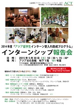 5月30日に、2014年度のインターン受入れ団体と留学生による報告会を行います。今回は、関東地区だけでなく、京都、愛知、兵庫、新潟、広島などの団体や留学生から、さまざまな分野で行ったインターンシップにより得られた経験と学びなどについて発表していただきます。