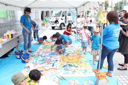 みんなでつくるよりよい社会や未来の環境をイメージして、大きな布地に思いきり絵を描いていただきます。手で書いたり、足を使ったり、身体全体を使って描くのもOK!