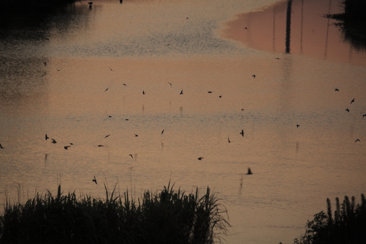 夕方、遊水地のビオトープのヨシ原をねぐらとして利用しているツバメたちを観察します。