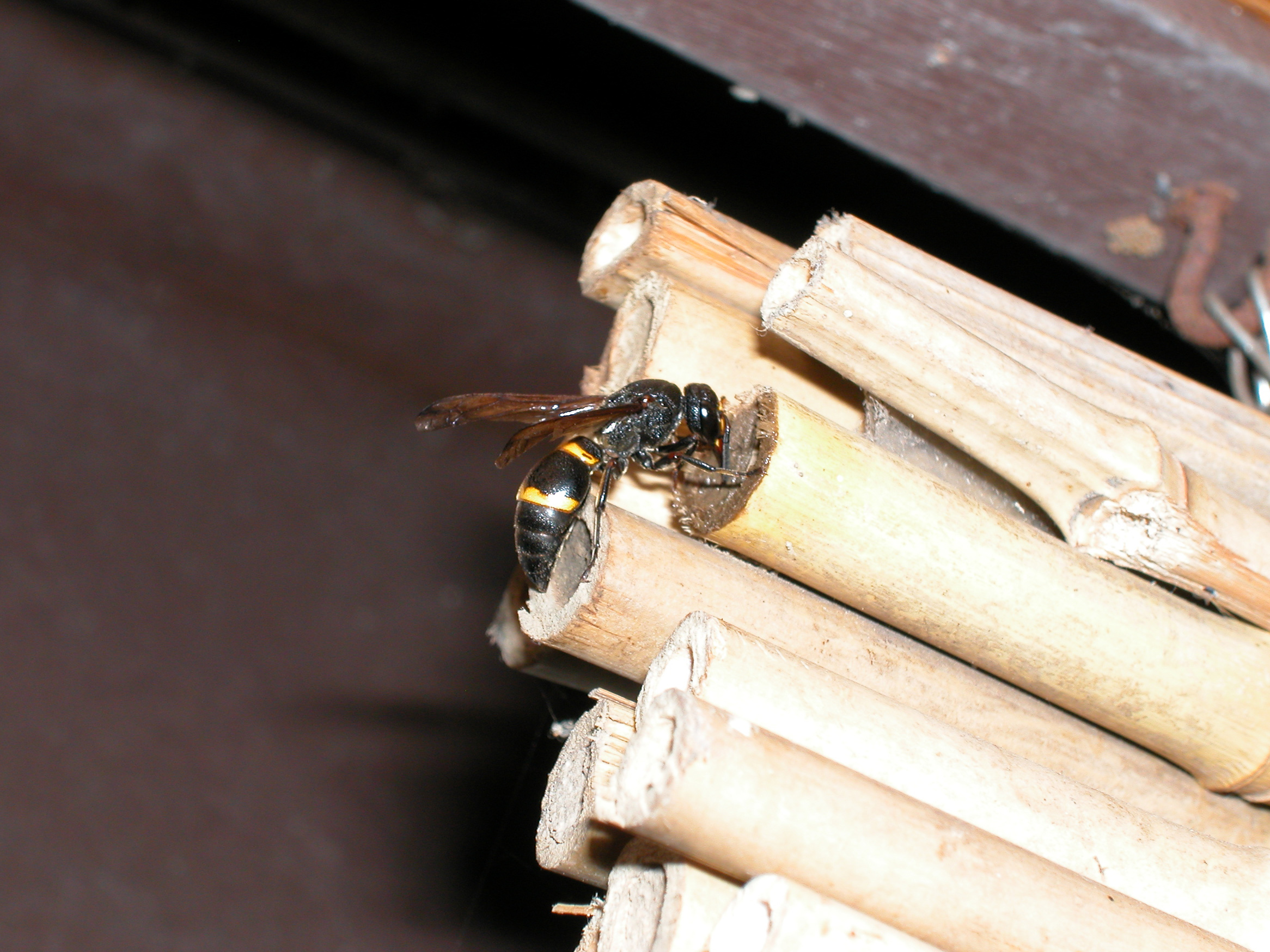 群れを作るミツバチ等とは違い、単独で生活するハチです。ガなどのイモムシを捕まえて針で麻酔をかけ、竹に詰め込み、そこに卵を産む…という生き方をしています。※よほどいじめなければ刺しませんし、毒性も弱いです。