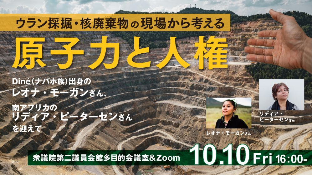 このたび、アメリカ南西部で、ウラン採掘、核廃棄物の設置や移送に反対し、人々の健康と土地の保護に取り組んでDiné(ナバホ族)出身のレオナ・モーガンさん、また南アフリカのケープタウンで、核問題と人々の権利確立のために活動するリディア・ピーターセンさんをゲストに迎え、原子力と人権を考える集会を開催します。