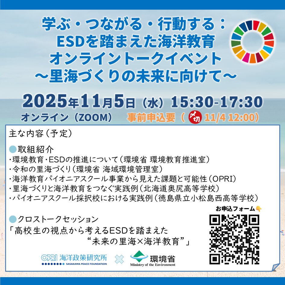 環境省と笹川平和財団海洋政策研究所(OPRI)の共催により、地域における里海づくりの推進や将来の担い手確保に重要な海洋教育に焦点を当てたオンライントークイベントを開催いたします。