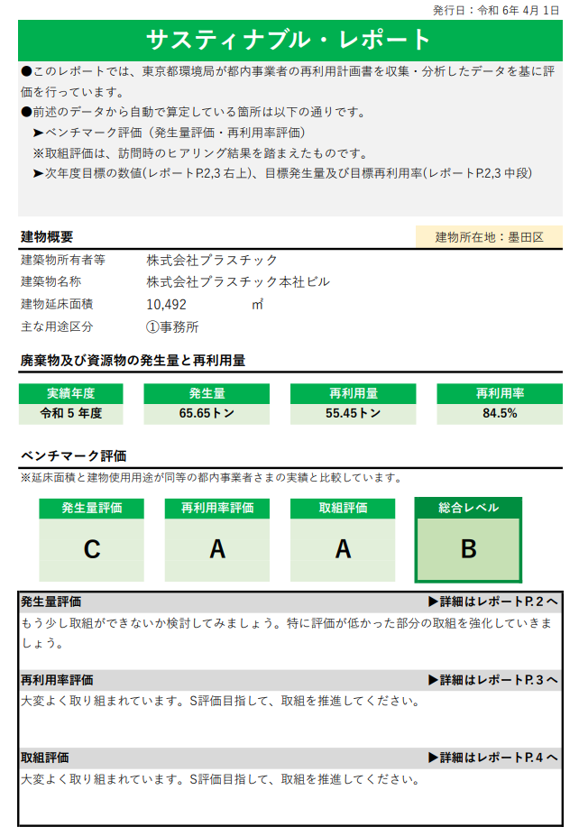 各事業所の現状に即した取組提案や詳細なアドバイスをまとめた「サスティナブル・レポート」をお渡しいたします。