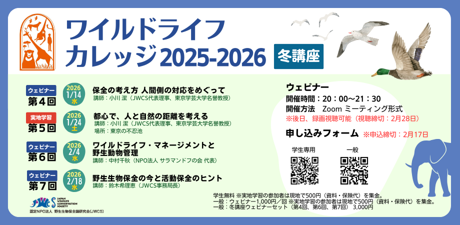 対象:ワイルドライフカレッジ2025-2026の全ウェビナー(夏講座・冬講座の全5回)受講者。