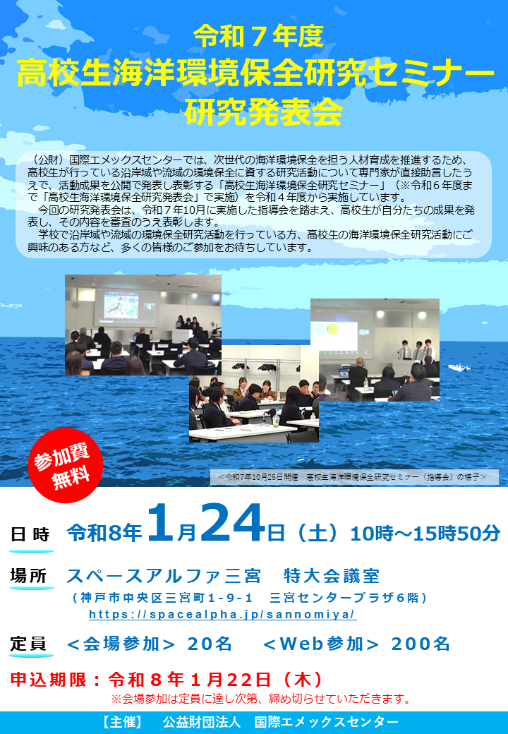 (公財)国際エメックスセンターでは、次世代の海洋環境保全を担う人材育成を推進するため、高校生が行っている沿岸域や流域の環境保全に資する研究活動について専門家が直接助言・指導したうえで、活動成果を公開で発表し表彰する「高校生海洋環境保全研究セミナー」(令和6年度まで「高校生海洋環境保全研究発表会」の名称で実施)を令和4年度から実施しています。