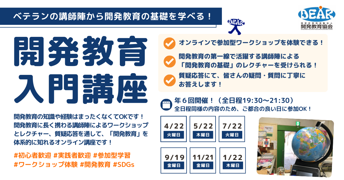 開発教育に長く携わる講師陣によるワークショップとレクチャー、質疑応答を通して、「開発教育」を体系的に知れるオンライン講座です!