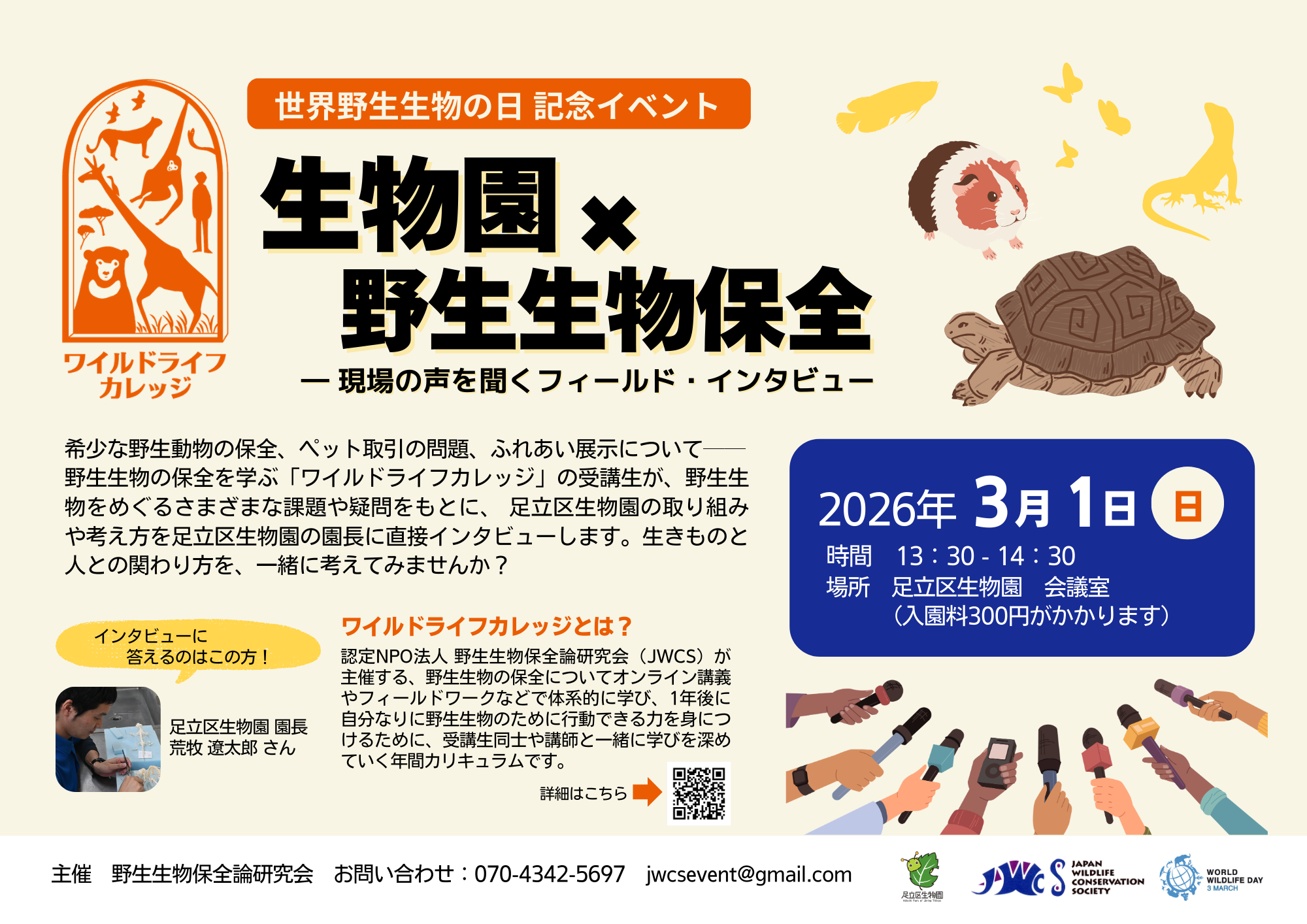 野生生物の保全を学ぶ「ワイルドライフカレッジ」の受講生が、野生生物をめぐるさまざまな課題や疑問をもとに、 足立区生物園の取り組みや考え方を足立区生物園の園長に直接インタビューします。