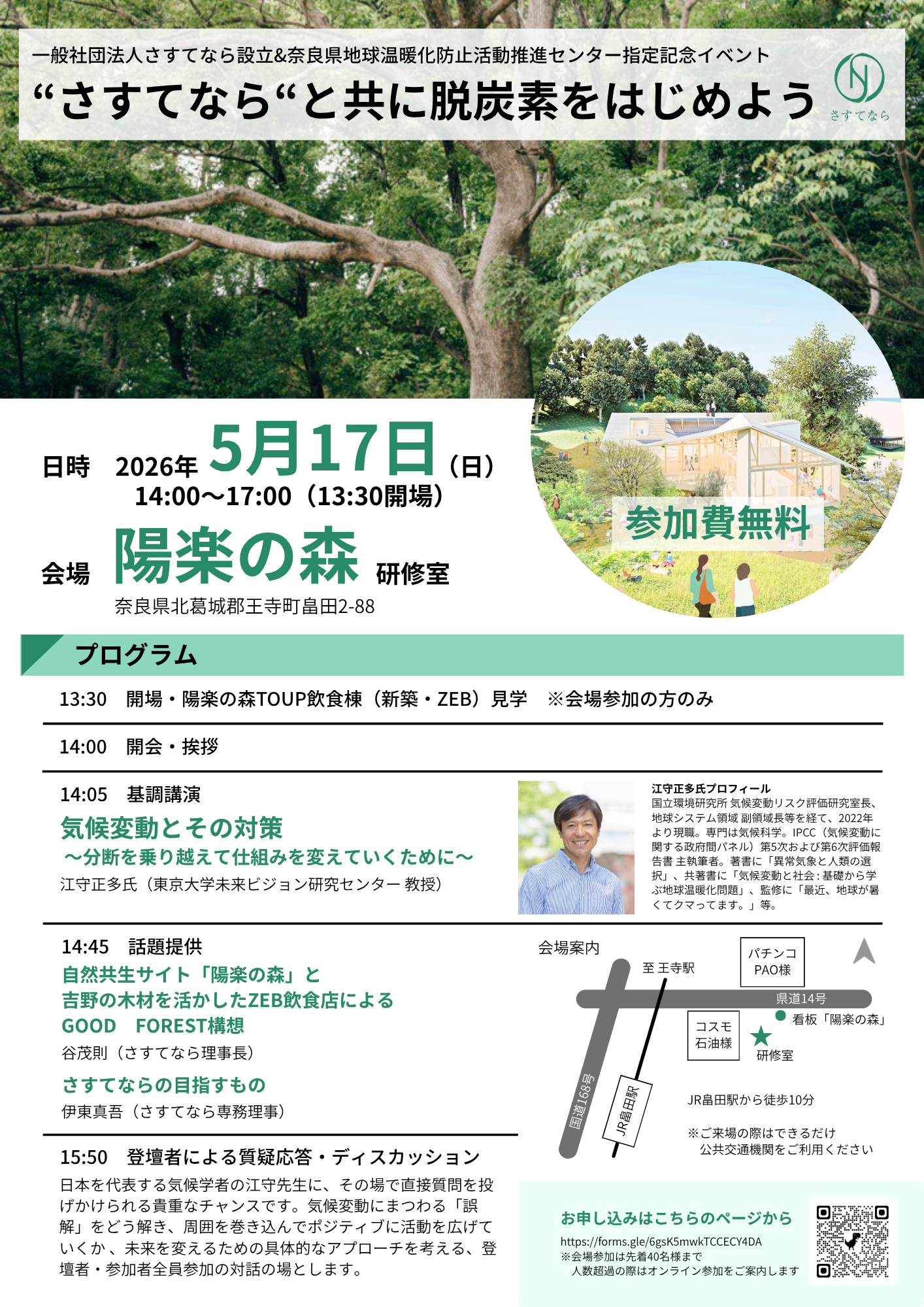 この度、一般社団法人さすてならは、法人の設立と奈良県地球温暖化防止活動推進センターの指定団体となったことを記念し、下記のイベントを開催いたします。本イベントでは、気候科学の第一人者である江守正多氏を講師にお迎えし、私たちが未来のために今何をすべきかを共に考えます 。また、当団体の拠点であり、環境省から「自然共生サイト」の認定を受けた「陽楽の森」にて、県内初事例となる木造ZEB(ネット・ゼロ・エネルギー・ビル)建築の見学会も実施いたします。脱炭素社会の実現に向けた新たな一歩を、ぜひご一緒に踏み出しませんか。